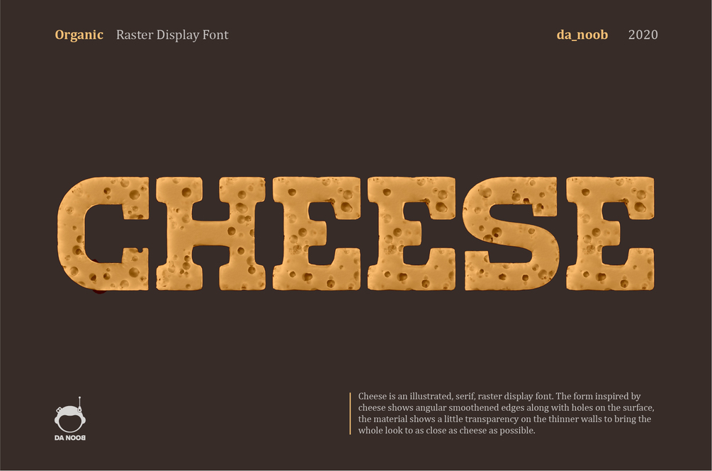 Cheese is an illustrated, serif, raster display font. The form inspired by cheese shows angular smoothed edges along with holes on the surface, the material shows a little transparency on the thinner walls to bring the whole look to as close as cheese as possible.
