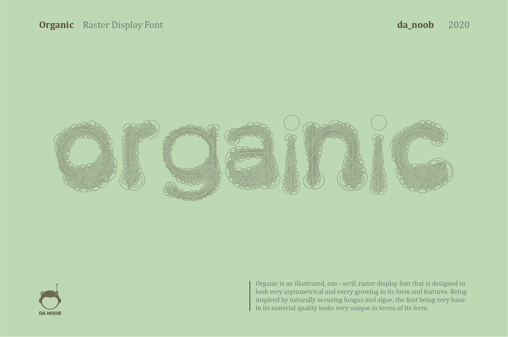 Organic is an illustrated, San - serif, raster display font that is designed to look very asymmetrical and every growing in its form and features. Being inspired by naturally occurring fungus and algae, the font being very basic in its material quality looks very unique in terms of its form.