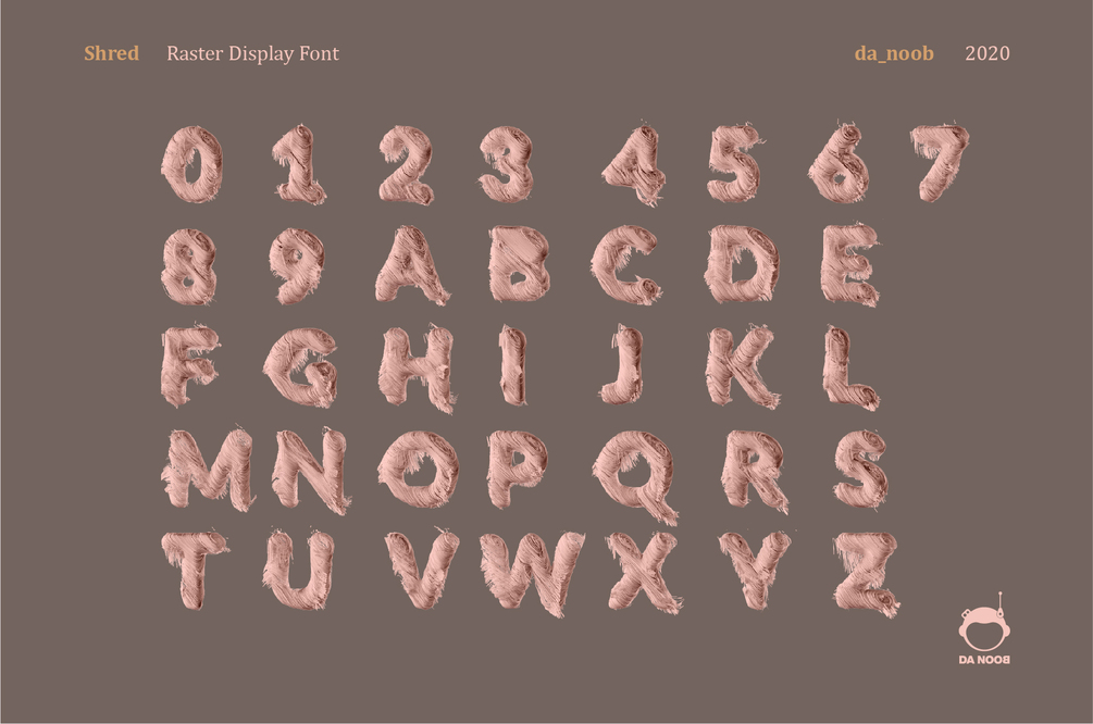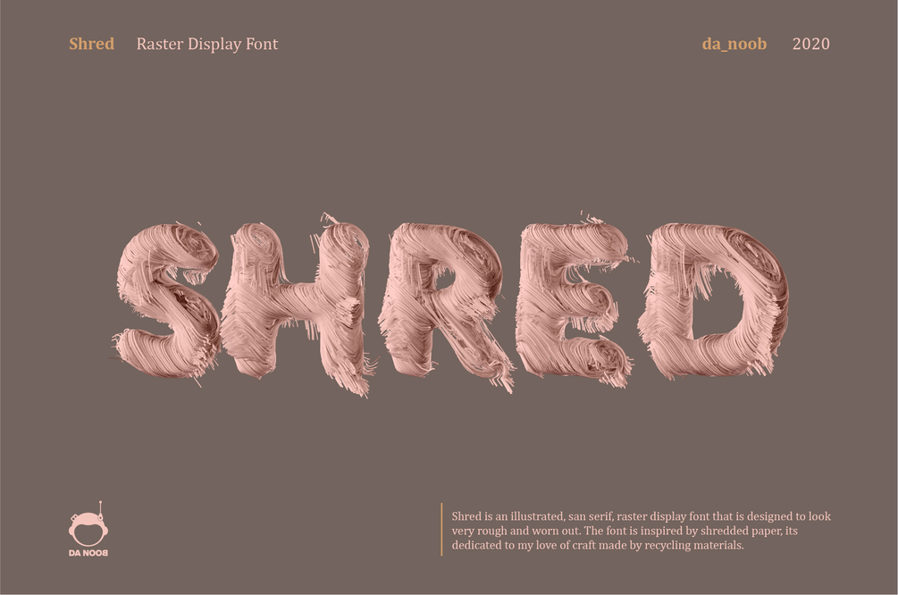 Shred is an illustrated, San serif, raster display font that is designed to look very rough and crafty. The font is inspired by shredded paper, its dedicated to my love of craft made of recycled materials.
